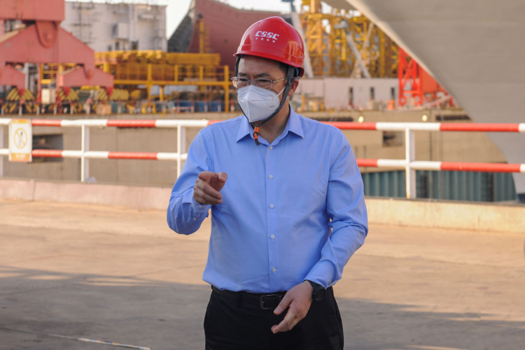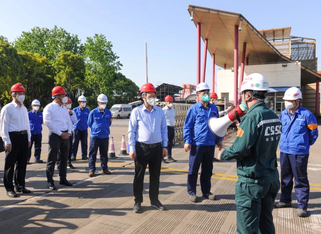 杨金成听取了外高桥造船近期疫情防控、复工复产工作以及生产经营情况的汇报,实地调研进出厂管理、隔离观察点建设以及生产人员封闭管理情况,并登上大型邮轮查看了复工复产准备情况。