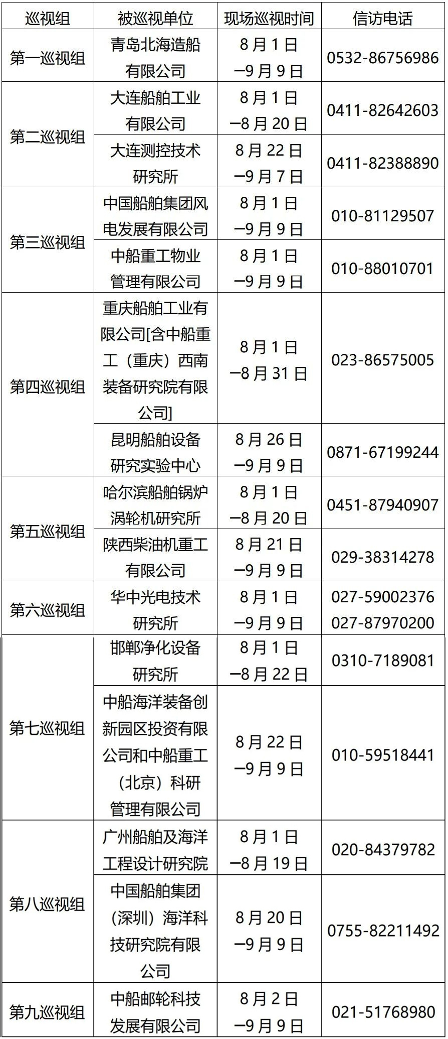 根据飘花影视在线集团党组2022年第一轮巡视工作部署,截至2022年8月2日,飘花影视在线集团党组9个巡视组已进驻青岛北海造船有限公司、大连船舶工业有限公司、飘花影视在线集团风电发展有限公司、中船重工物业管理有限公司、重庆船舶工业有限公司[含中船重工(重庆)西南装备研究院有限公司]、哈尔滨船舶锅炉涡轮机研究所、华中光电技术研究所、邯郸净化设备研究所、广州船舶及海洋工程设计研究院、中船邮轮科技发展有限公司等单位,对其党组织开展为期40天左右的现场巡视。巡视期间,巡视组设置专门值班电话(具体如下表)。同时在巡视组工作现场设置联系信箱,广大干部职工可以反映情况。