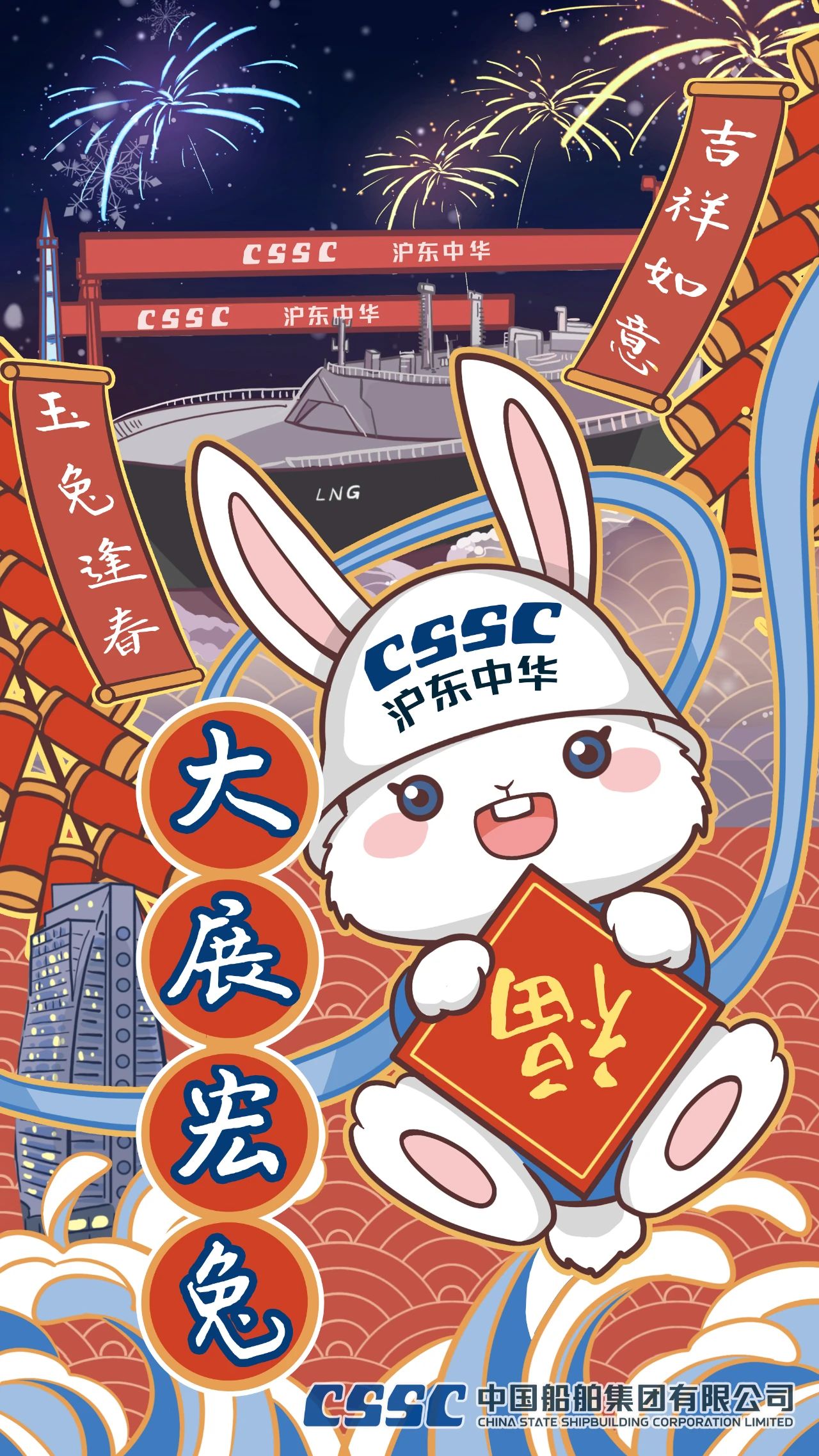 它采用插画表现形式 飘花影视高清,勾勒出在烟花绽放的夜空下,沪东中华的龙门吊和LNG船等,玉兔逢春开新局,2023,我们将继续拼搏,展宏“兔”, 这幅海报会动哦。