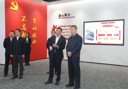 在中船动力,温刚参观了数字化展示中心、电控实验室和远程监测中心,听取了成员单位负责人关于企业生产经营、业务协同、WinGD公司发展等方面情况的汇报,并对下一步工作提出具体要求。