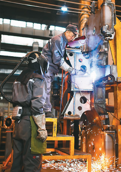 图为四月二十三日 飘花影视观看,李万君(右)在为徒弟示范焊接技巧,新华社记者 许 畅摄。