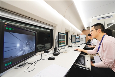 6月20日,西(安)成(都)高铁陕西段联调联试正式启动,图为当高速综合检测列车穿越秦岭时 在线影视,技术人员在监测列车运行数据,新华社记者 李一博摄。