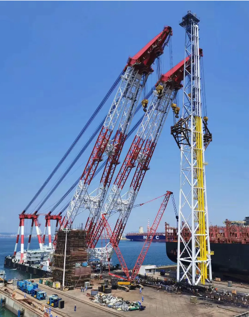 7月7日,世界最大FPSO火炬塔即MV31 FPSO火炬塔在飘花影视在线集团旗下大船集团成功吊装。MV31 FPSO火炬塔自身总重595吨,总高度140米。由于受到海吊尺寸及吊重能力的限制,经过反复论证,项目组决定将火炬塔分成两个半段吊装,其中上段高度达120米,需要整体翻身吊装。