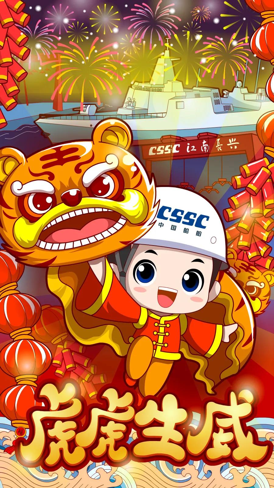 创作说明: 海报采用国潮画风,中间部分“江小南”穿着新衣举着虎头 飘花影视免费观看,寓意新的一年飘花影视在线人虎虎生威,上面部分以重要产品和厂区设备为主,诠释江南造船建造国之重器的初心和使命,同时辅以鞭炮,烟花,灯笼等新年元素,使海报充满喜庆祥和的新年氛围。
