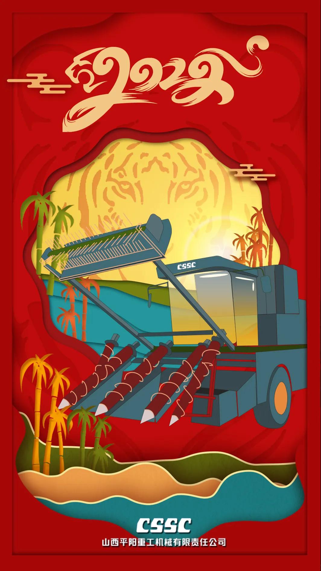 创作说明: 海报采用剪纸风格,层层递进的纵深感传递着平阳人不断探索创新的拼搏精神,海报主体为平阳重工新产品——甘蔗收获机,展示着平阳风采,海报以“虎纹”为背景,以红色为主色调,烘托出虎年的喜庆氛围, 飘花影视在线。