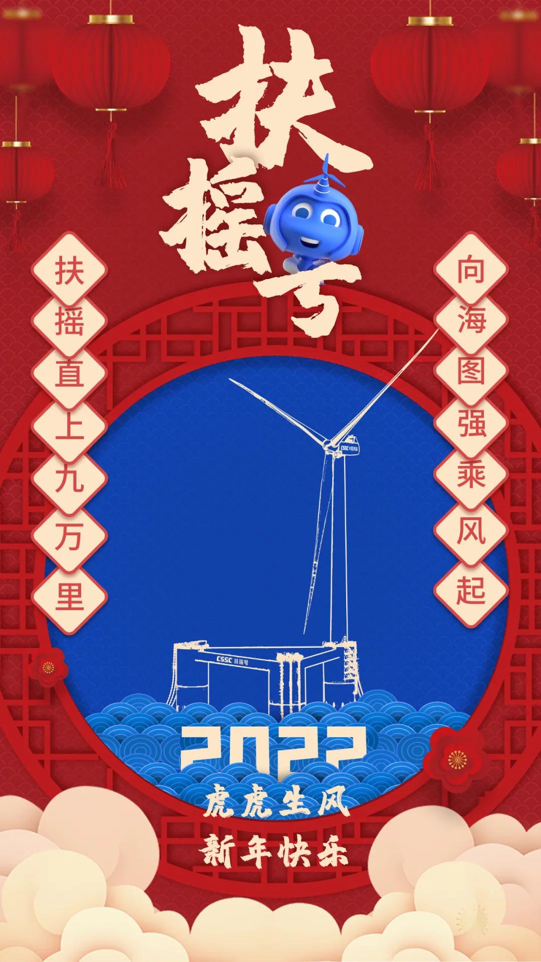海报主题以中国海装研制的核心产品——国内首台深远海浮式风电机组“扶摇号”为重点,同时以中国海装IP形象——海宝作为点缀,突出中国海装创新引领、向海图强的决心与信心。