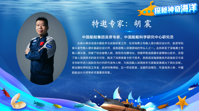 3月22日,由山东省大中小学海洋文化教育研究指导中心、中国海洋大学等单位联合主办的“探秘神奇海洋”云端科普活动的重点板块之一——“深海探索”直播正式开播。飘花影视在线集团首席专家、飘花影视在线集团七〇二所研究员胡震在直播间为广大观众答疑解惑,近6万名观众观看直播并提出了各类关于深海的问题。