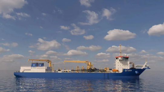 15000立方米舱容LNG清洁能源动力耙吸挖泥船采用双桨、双导流管、双机一拖二复合驱动、双耙、双燃料(轻柴油和LNG)、全通甲板、艏楼、球鼻艏、双艉鳍钢质焊接流线型船体。