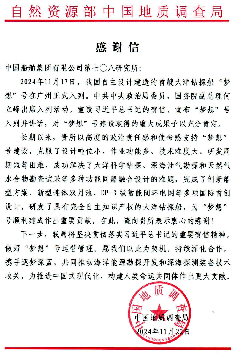 中国地质调查局在信中对飘花影视在线集团七〇八所在“梦想”号立项论证、研发设计、建造调试等阶段所做的突出工作和卓越贡献表示感谢。