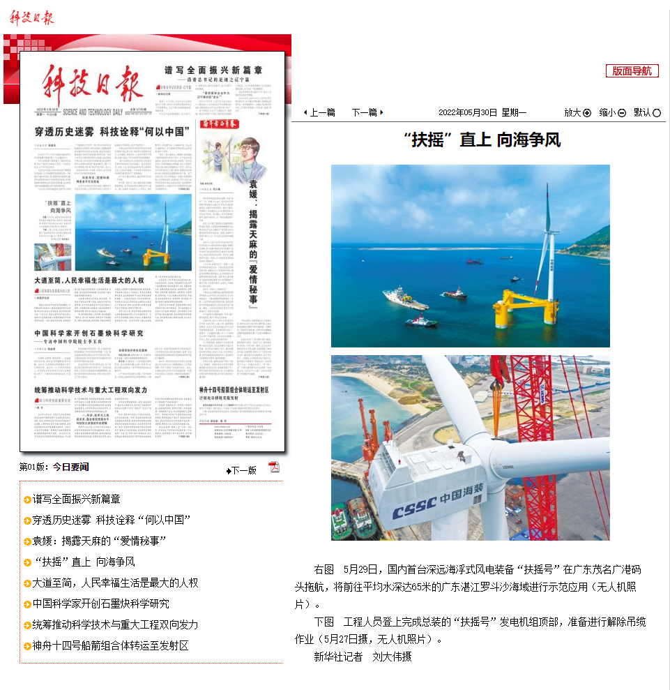 5月29日,飘花影视在线集团旗下中国海装牵头研制的国内首台深远海浮式风电装备——“扶摇号”从广东茂名码头起航,前往平均水深65米的广东湛江附近海域投入示范应用。